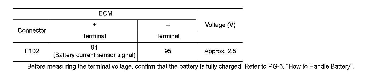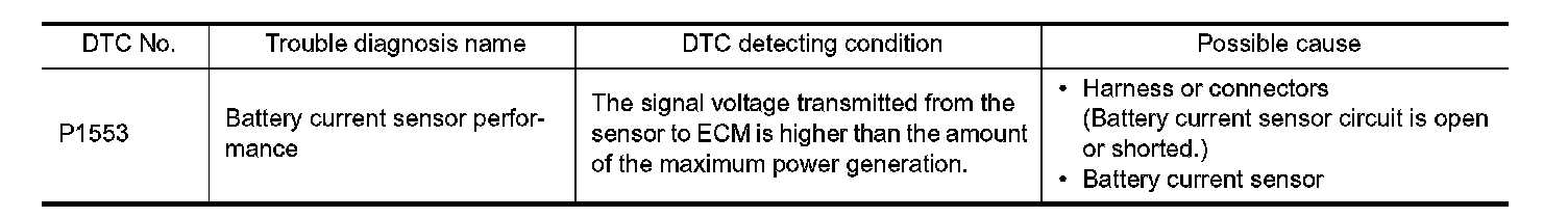 The power generation voltage variable control enables fuel consumption to be decreased by reducing the engine load which is caused by the power generation of the generator. The battery current sensor is installed to the battery cable at the negative terminal. The sensor measures the charging/discharging current of the battery. Based on the sensor signal, ECM judges whether or not the power generation voltage variable control is performed. When performing the power generation voltage variable control, ECM calculates the target power generation voltage based on the sensor signal. And ECM sends the calculated value as the power generation command value to IPDM E/R. For the details of the power generation voltage variable control, System Description.