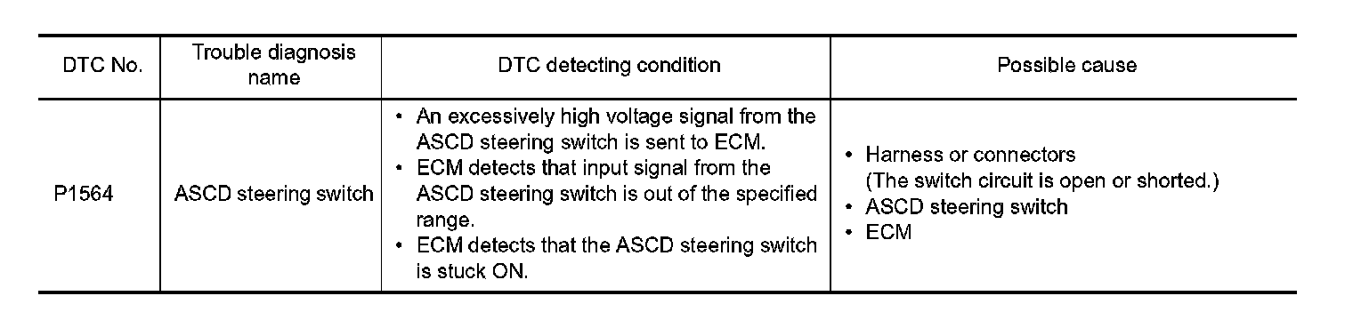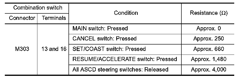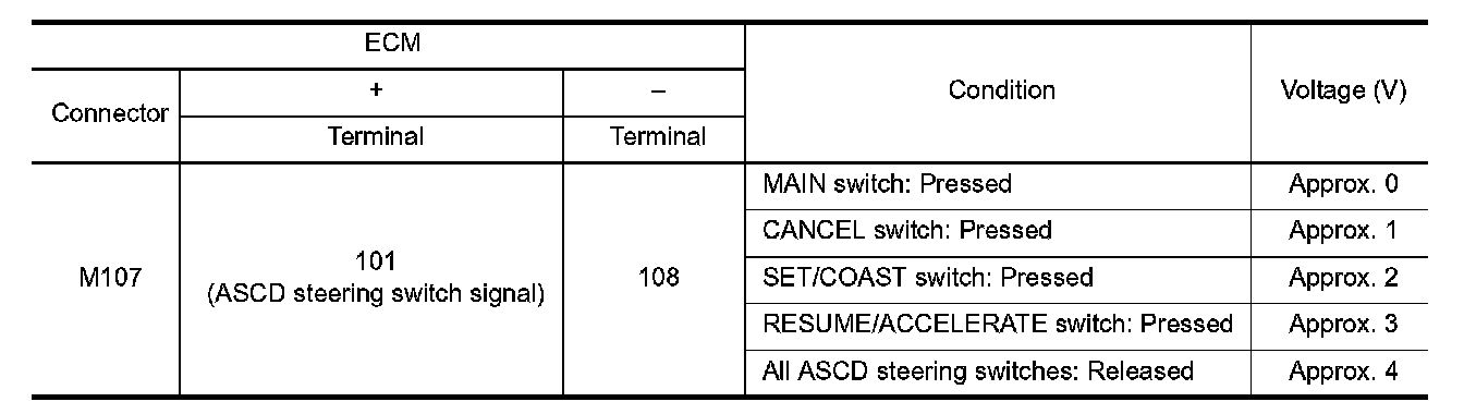 ASCD steering switch has variant values of electrical resistance for each button. ECM reads voltage variation of switch, and determines which button is operated. System Description for the ASCD function.