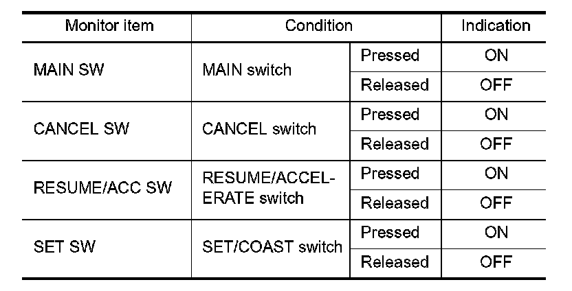 2. Select "MAIN SW", "CANCEL SW", "RESUME/ACC SW" and "SET SW" in "DATA MONITOR" mode with
