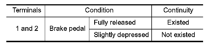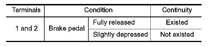 2. Check the continuity between stop lamp switch terminals under the following conditions.