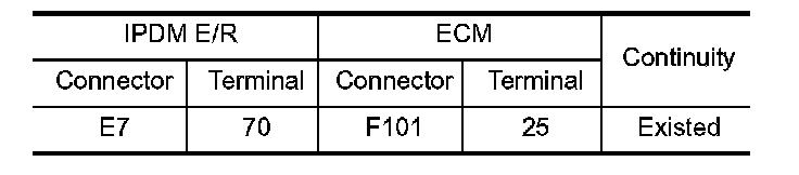4. Check the continuity between IPDM E/R harness connector and ECM harness connector.
