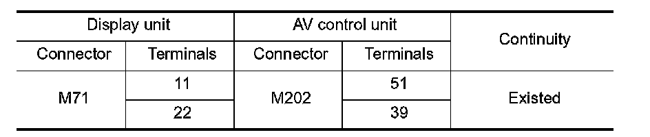 3. Check continuity between display unit harness connector and AV control unit harness connector.