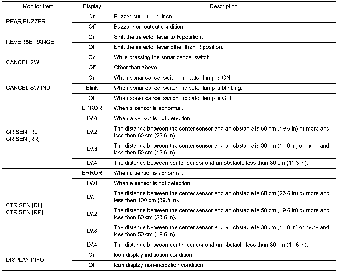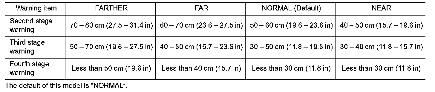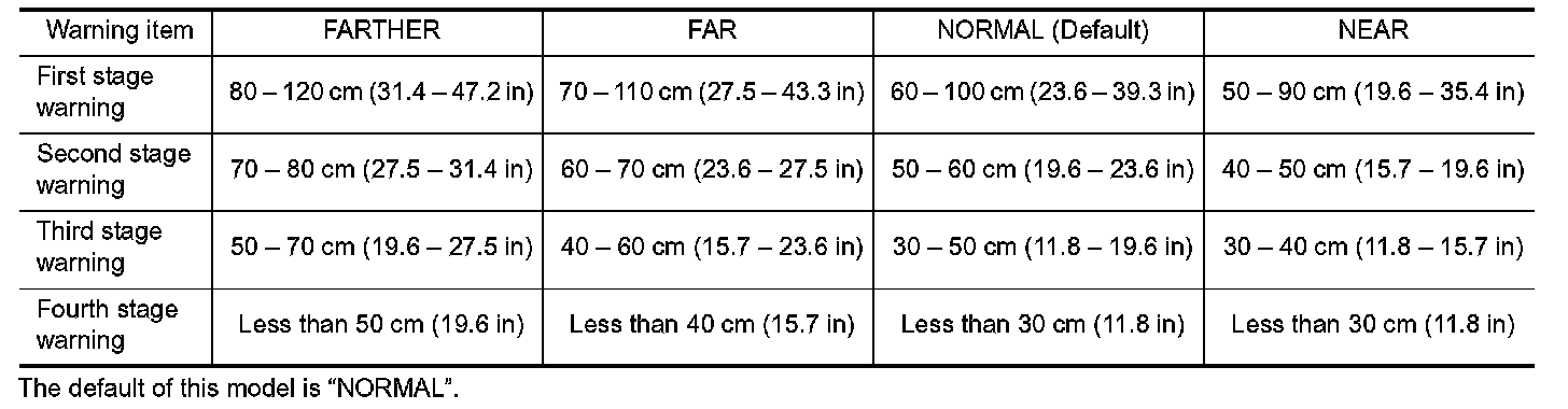 Center sensor (RR, RL) only is adjustable not to detect the distance less than 40 cm (15.7 in).