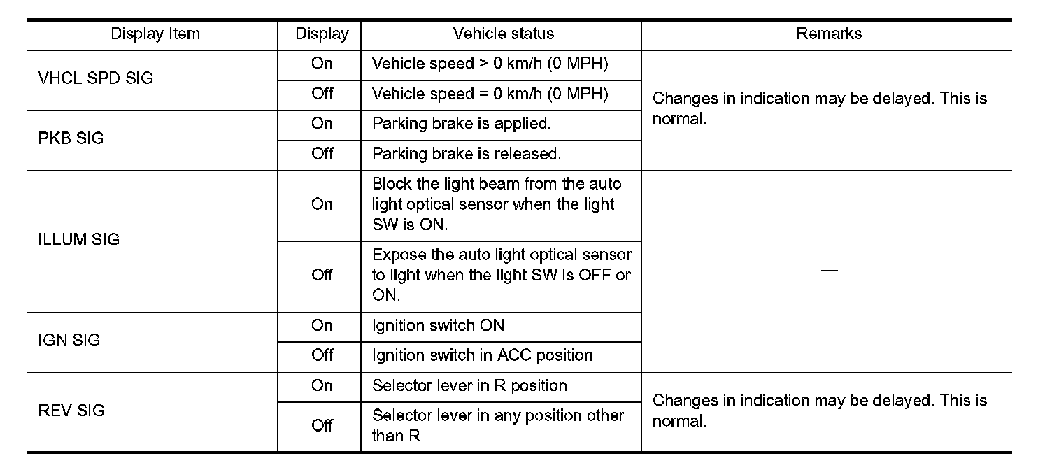 - Displays the status of the following vehicle signals inputted into the AV control unit.