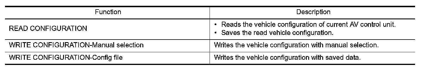 CONSULT-III performs the following functions via the communication with the AV control unit.
