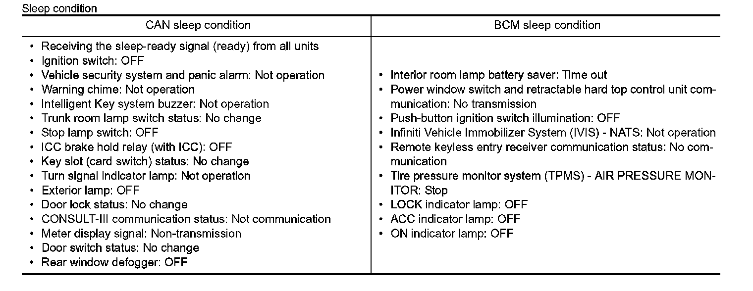 - BCM transmits the sleep wake up signal (sleep) to each unit when all of the CAN sleep conditions are fulfilled.