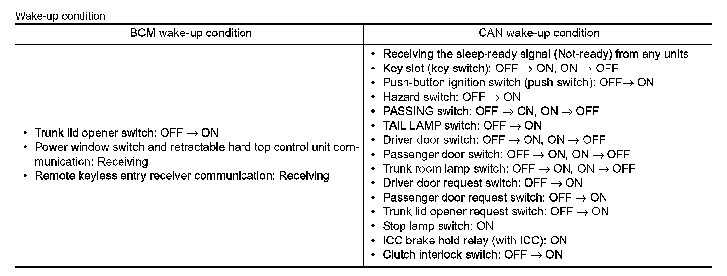 - BCM transmits the sleep wake up signal (wake up) to each unit when any of the CAN wake-up conditions is fulfilled. It changes from the low power consumption mode or the CAN communication sleep mode to the normal mode.
