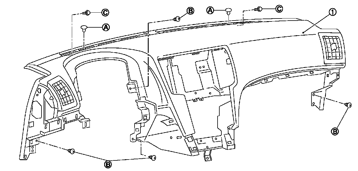 - Remove screws (B) and bolts (C) with power tool, and then remove instrument panel assembly (1).