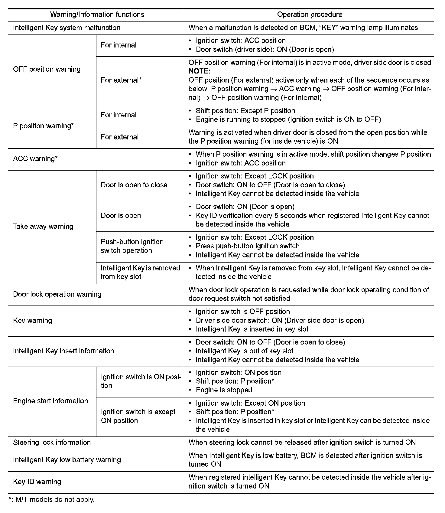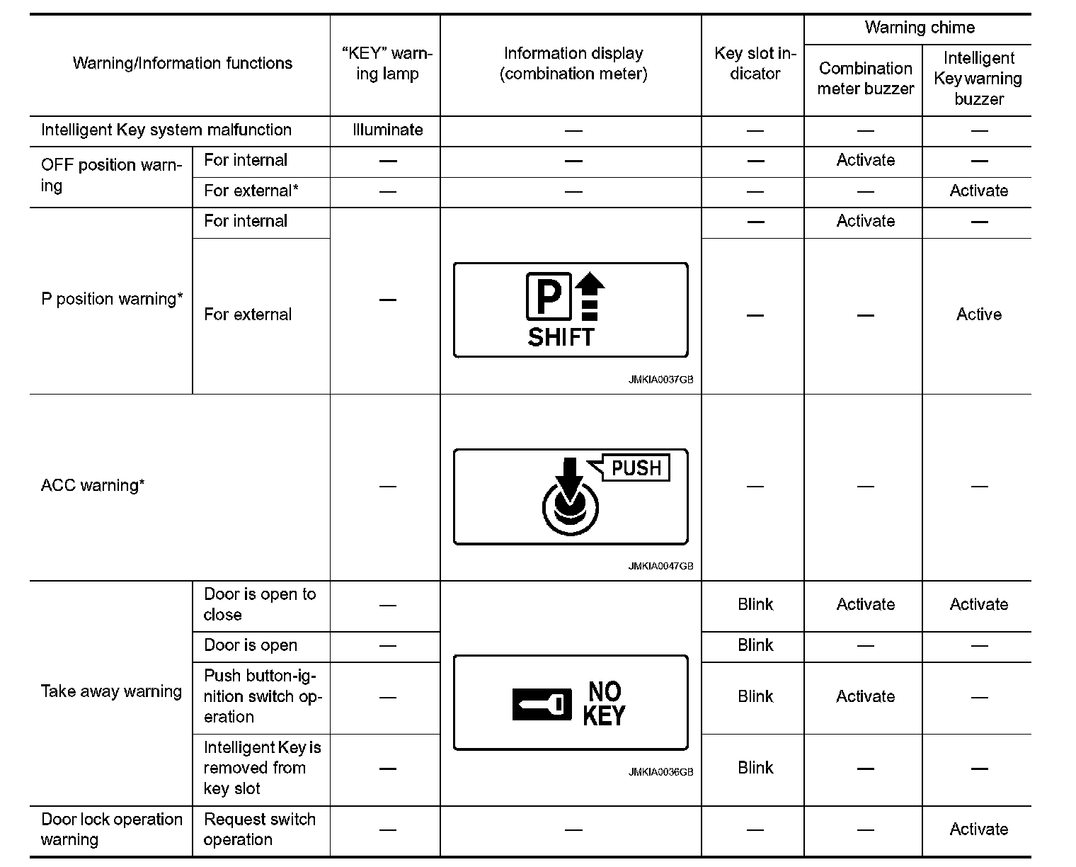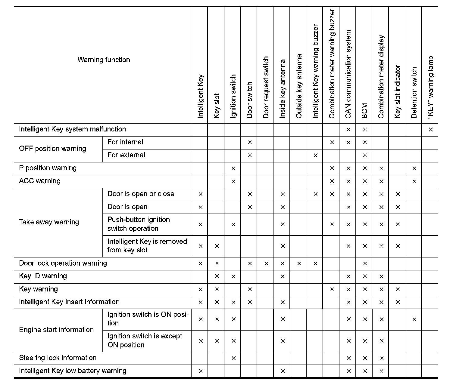 The warning function are as per the following items and are given to the user as warning information and warnings using combinations of Intelligent Key warning buzzer, combination meter buzzer, KEY warning lamp, key slot indicator and information display in combination meter.