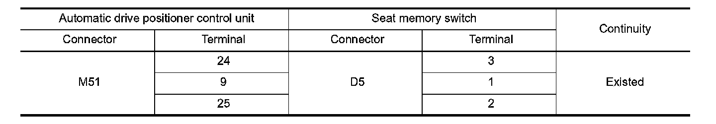 3. Check continuity between automatic drive positioner control unit harness connector and seat memory switch harness connector.