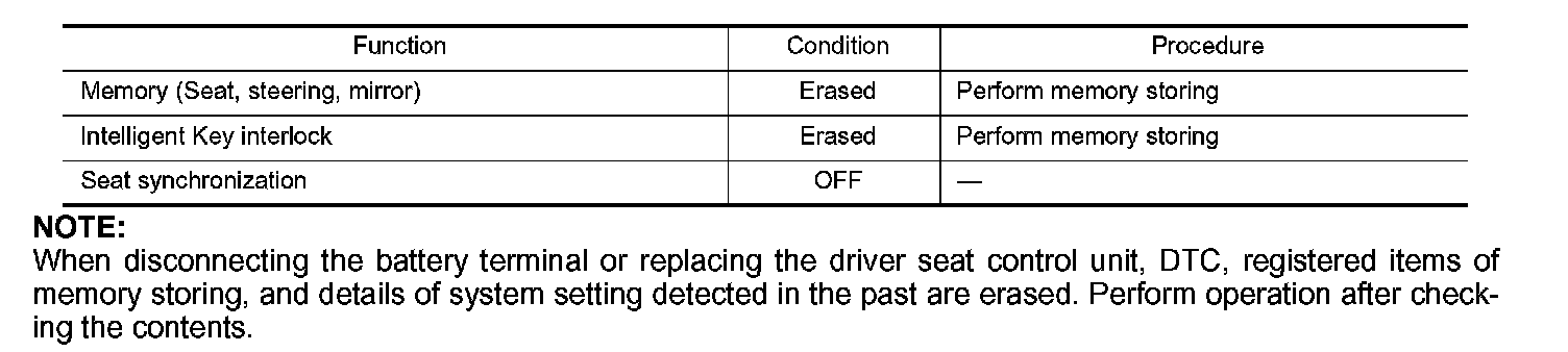 Each function is reset to the following condition when the battery terminal is disconnected.