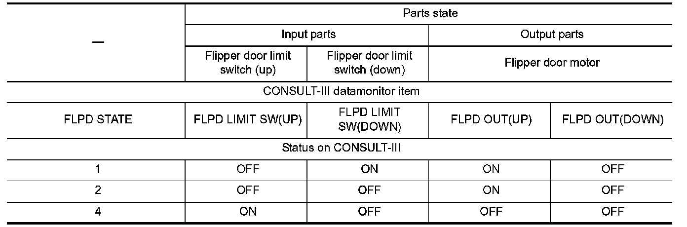 Parts state (CONSULT-III display) according to sequential flipper door operations is as shown in the following table.