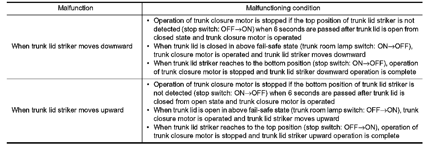 Fail-safe function is adopted to trunk lid auto closure system as per the following table.