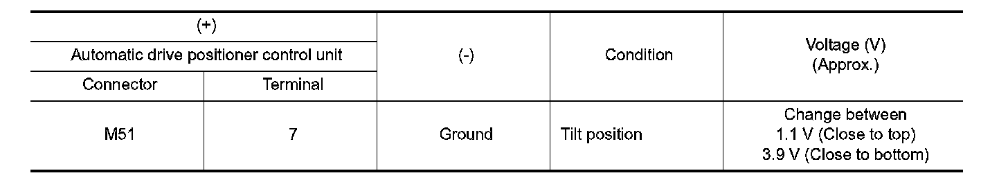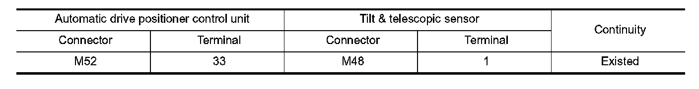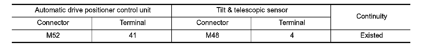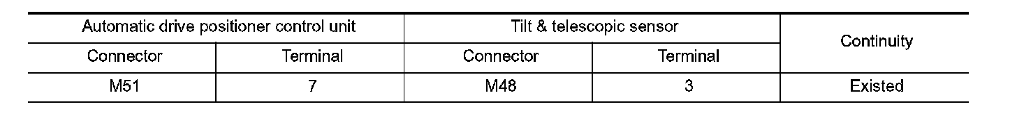 3. Check continuity between automatic drive positioner control unit harness connector and tilt & telescopic sensor harness connector.
