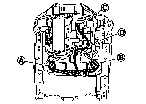 - Locate lumbar support switch harness crossing in the upper position, fix seat control harness connector (B), lumbar support switch harness connector (C), and side support harness connector (D) as shown in the figure.