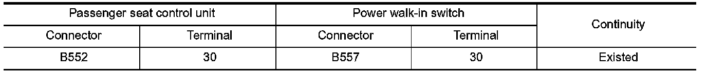 2. Check continuity between passenger seat control unit harness connector and power walk-in switch harness connector.