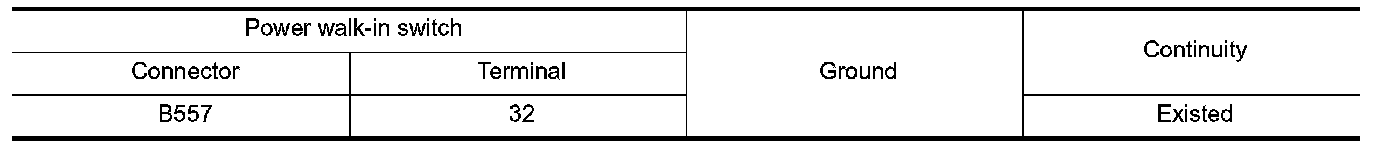 Check continuity between power walk-in switch harness connector and ground.