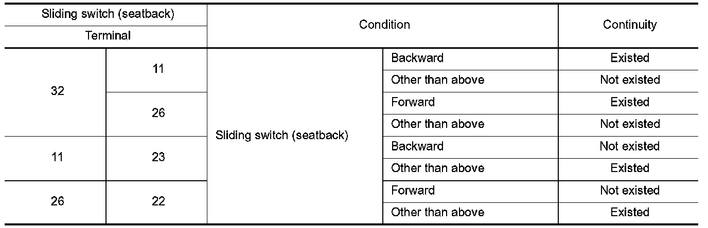 3. Check continuity between sliding switch (seatback) terminals.