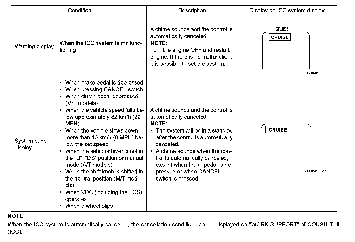 In the conventional (fixed speed) cruise control mode, a warning chime does not sound to warn driver if own vehicle are too close to the vehicle ahead, as neither the presence of the vehicle ahead nor the vehicle-to-vehicle distance is detected.