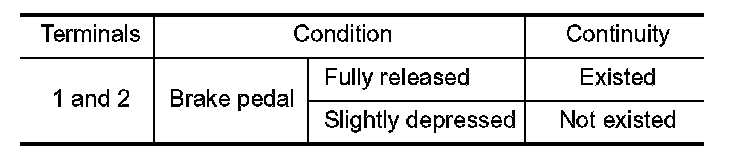 2. Check the continuity between ASCD brake switch terminals under the following conditions.