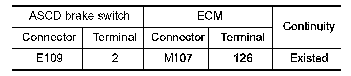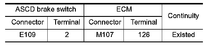 3. Check the continuity between ASCD brake switch harness connector and ECM harness connector.