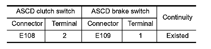 2. Check the continuity between ASCD clutch switch harness connector and ASCD brake switch harness connector.