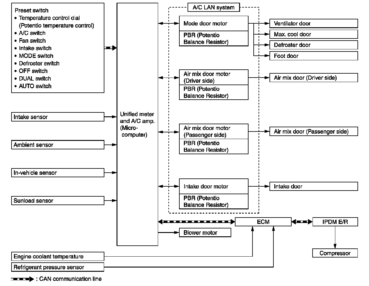 The control system consists of input sensors, switches, unified meter and A/C amp. (microcomputer) and outputs. The relationship of these components is as shown in the figure below:
