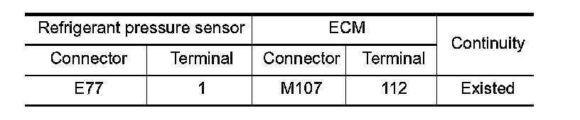 1. Check the continuity between refrigerant pressure sensor harness connector and ECM harness connector.