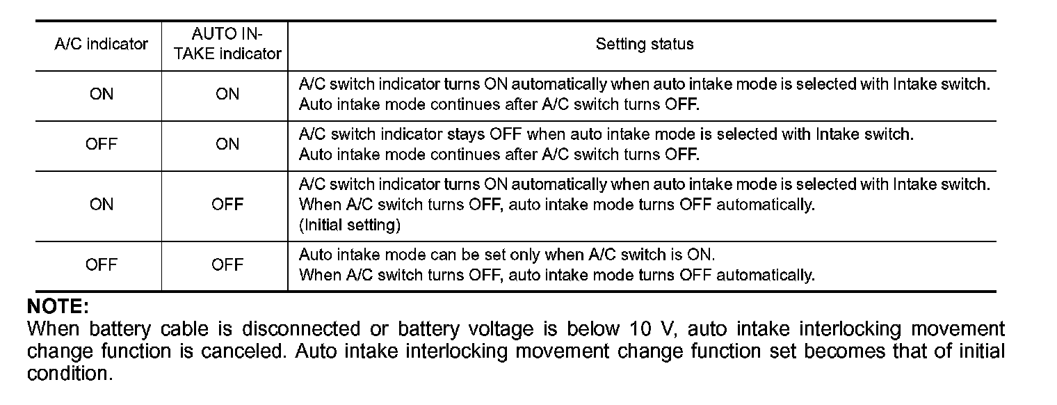 Conditions for interlocking movement of intake switch (auto intake mode) and A/C switch can be changed. In addition, operation of the intake switch, which activates the auto intake control system, can be set to become available when the A/C switch is ON.
