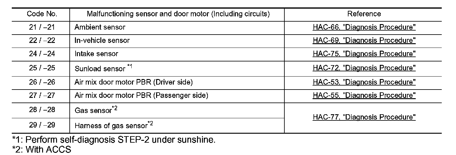 The self-diagnosis system is built into the unified meter and A/C amp. to quickly locate the cause of malfunctions. The self-diagnosis system diagnoses sensors, door motors, blower motor, etc. by system line. Refer to applicable sections (items) for details.