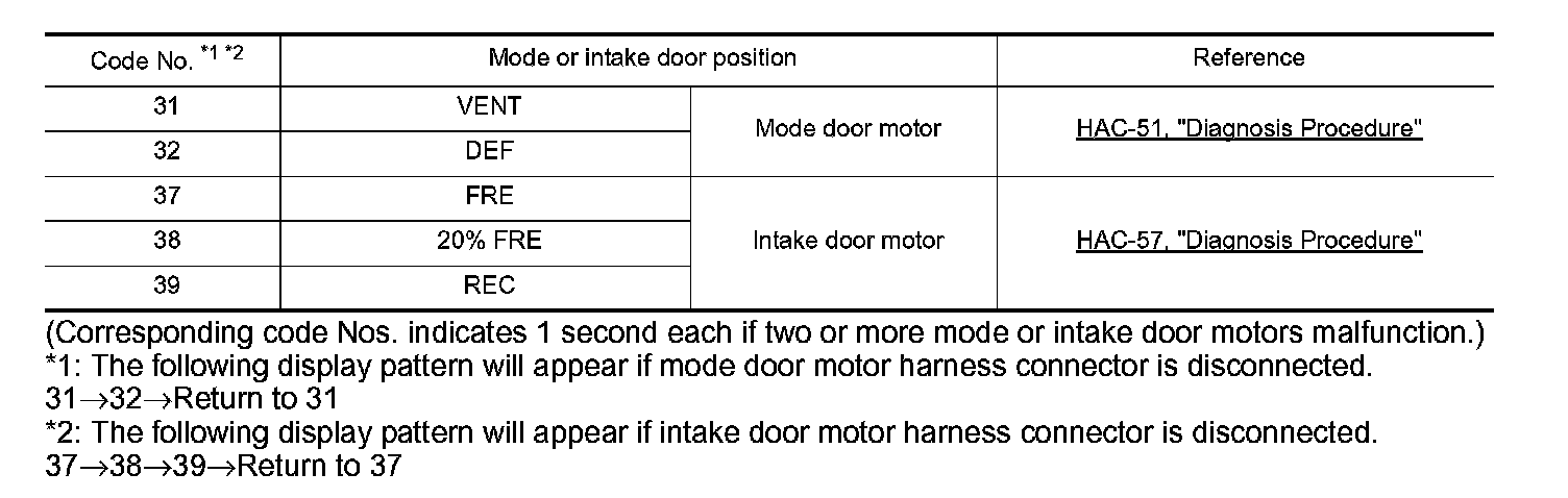 2. CAN communication error between each unit that uses the unified meter and A/C amp. can be detected as self-diagnosis results. (The display of each error will blink twice for 0.5 second intervals if plural errors occur.)