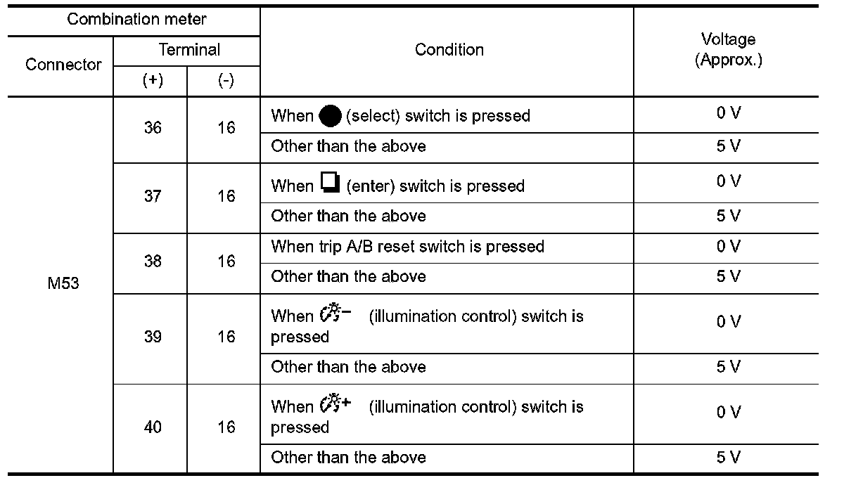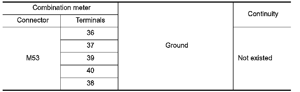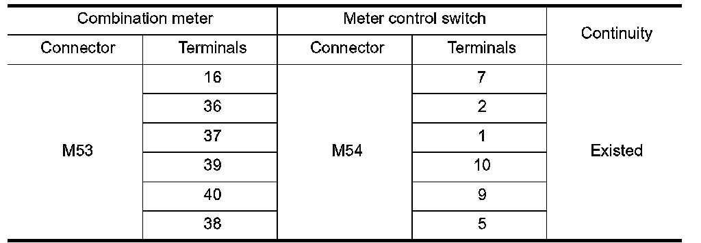 3. Check continuity between combination meter harness connector terminal and meter control switch harness connector terminal.