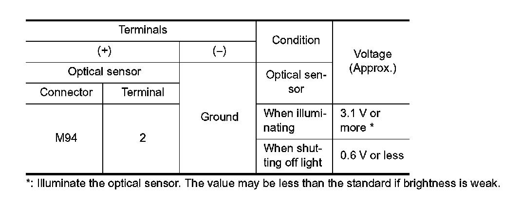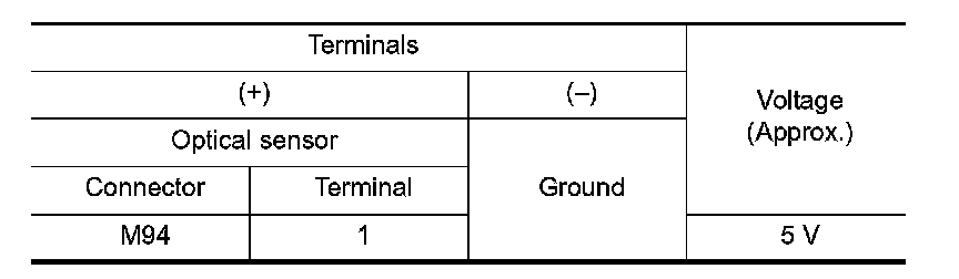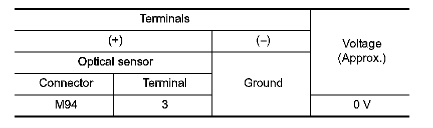 With illuminating the optical sensor, check the voltage between the optical sensor harness connector and the ground.