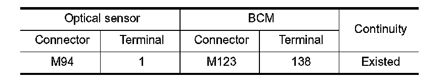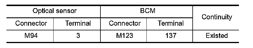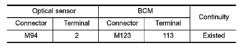3. Check continuity between the optical sensor harness connector and the BCM harness connector.