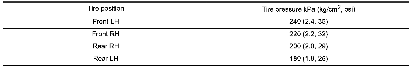 1. Adjust the tire pressure for all wheels to match the list below.