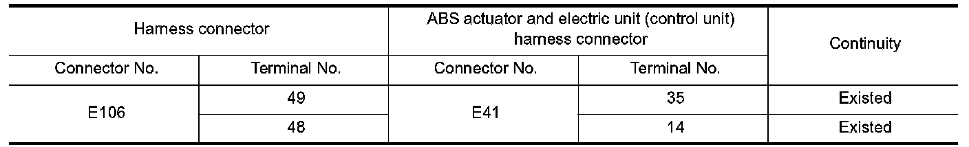 NO - Repair the main line between the harness connector E106 and the ABS actuator and electric unit