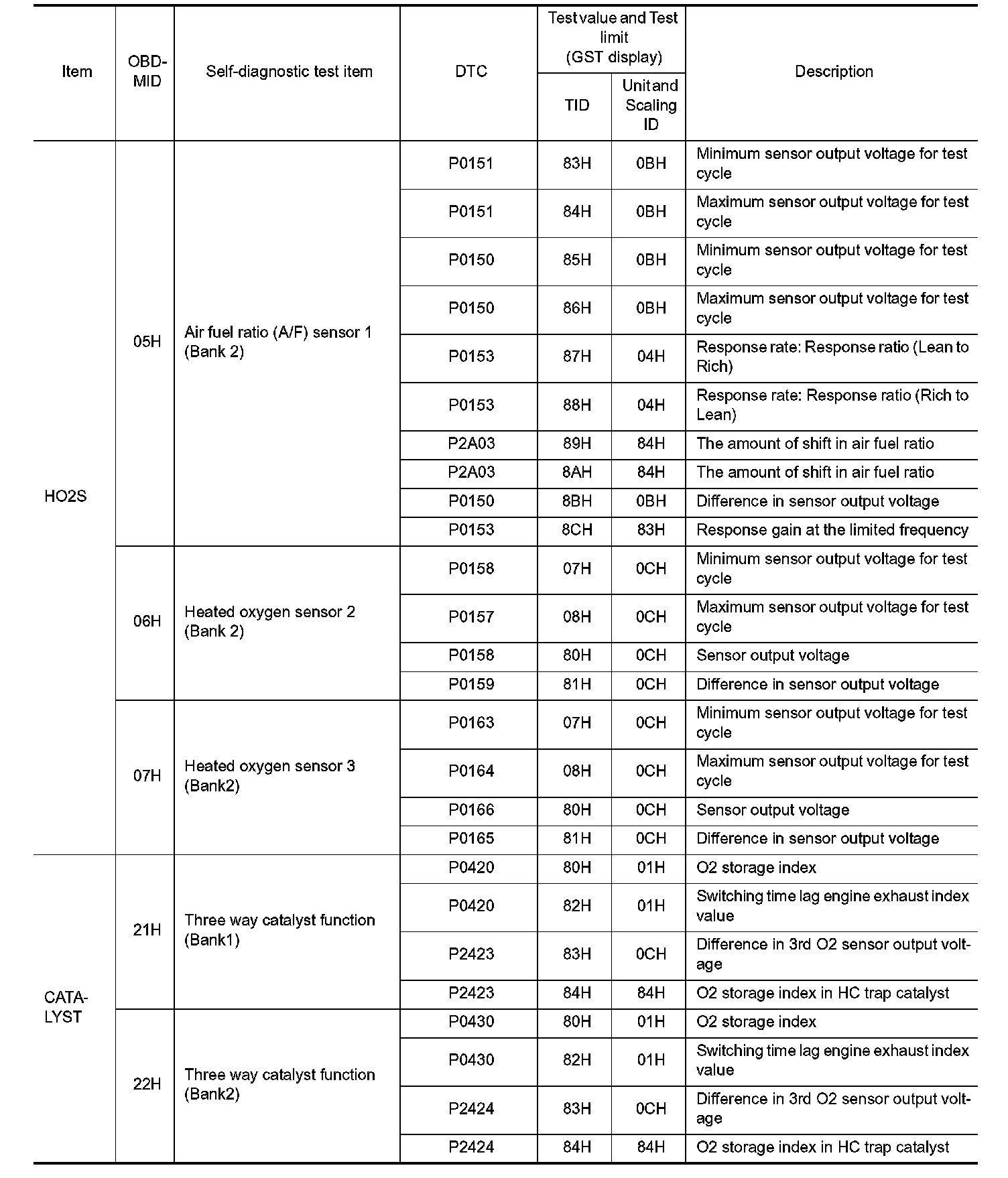 The items of the test value and test limit will be displayed with GST screen which items are provided by the ECM. (eg., if bank 2 is not applied on this vehicle, only the items of bank 1 are displayed)