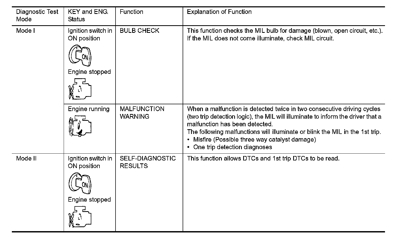 1. The MIL will illuminate when the ignition switch is turned ON without the engine running. This is a bulb check.