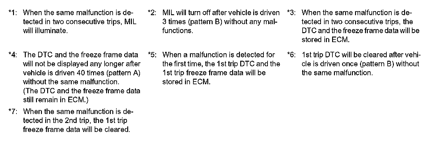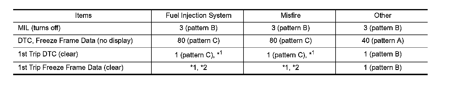 - The DTC and the freeze frame data will be stored until the vehicle is driven 40 times (driving pattern A) without the same malfunction recurring (except for Misfire and Fuel Injection System). For Misfire and Fuel Injection System, the DTC and freeze frame data will be stored until the vehicle is driven 80 times (driving pattern