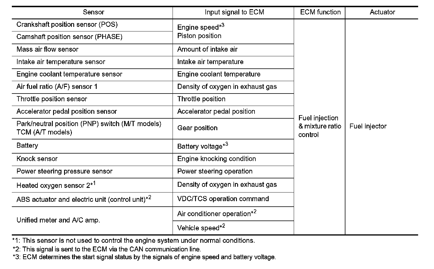 The amount of fuel injected from the fuel injector is determined by the ECM. The ECM controls the length of time the valve remains open (injection pulse duration). The amount of fuel injected is a program value in the ECM memory. The program value is preset by engine operating conditions. These conditions are determined by input signals (for engine speed and intake air) from the crankshaft position sensor (POS), camshaft position sensor (PHASE) and the mass air flow sensor.