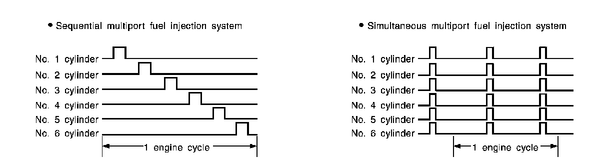 Fuel is injected simultaneously into all six cylinders twice each engine cycle. In other words, pulse signals of the same width are simultaneously transmitted from the ECM.