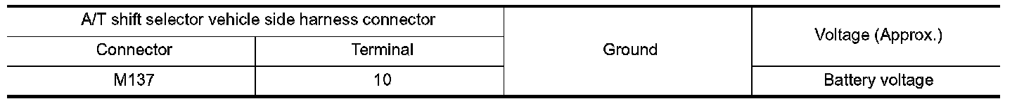 4. Check voltage between A/T shift selector vehicle side harness connector terminal and ground.
