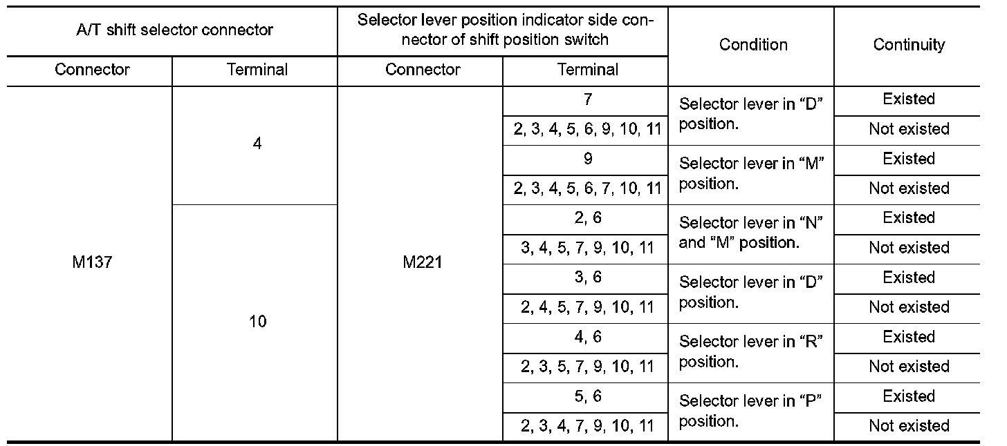 2. Check continuity between A/T shift selector connector terminals and selector lever position indicator side connector terminals of shift position switch.