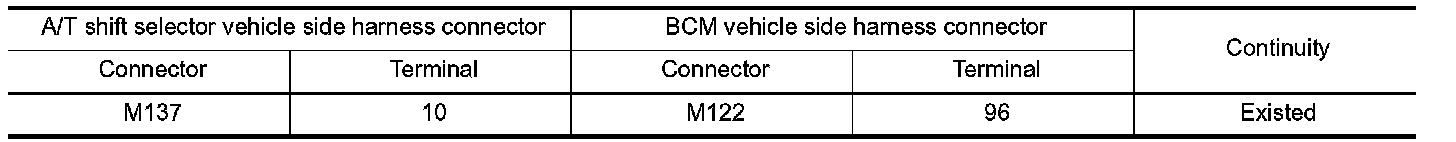 3. Check continuity between A/T shift selector vehicle side harness connector terminal and BCM vehicle side harness connector terminal.