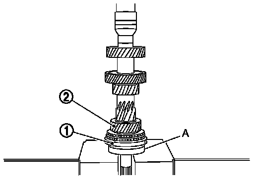 a. Set 4th counter gear thrust washer (1), 4th gear bushing, 4th needle bearing, and 4th counter gear to the inserter (A) [SST: