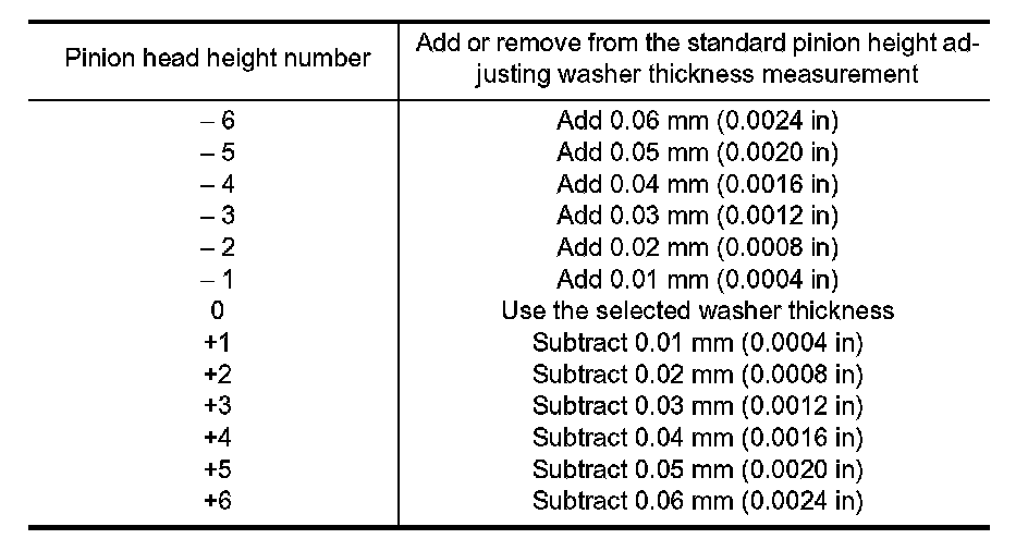 There are two numbers painted on the drive pinion. The first one refers to the drive pinion and drive gear as a matched set. This number should be the same as the number on the drive gear. The second number is the "pinion head height number". It refers to the ideal pinion height from standard for quietest operation. Use the following chart to determine the correct pinion height washer.