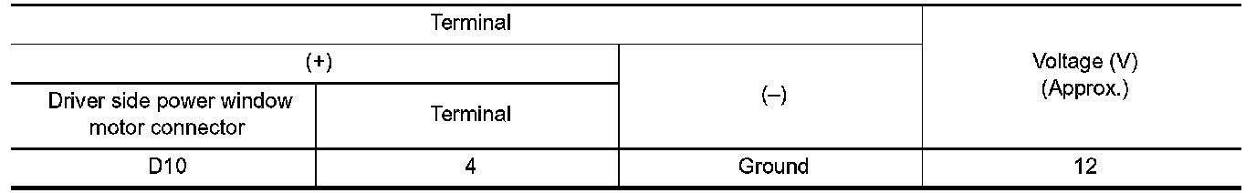 3. Check voltage between driver side power window motor harness connector and ground.