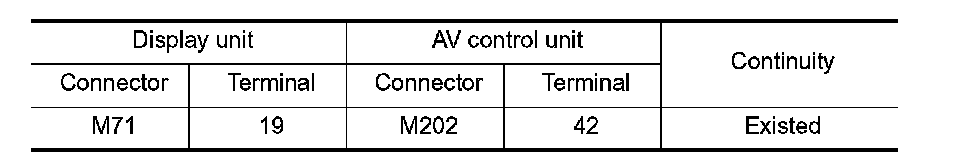 3. Check continuity between display unit harness connector and AV control unit harness connector.