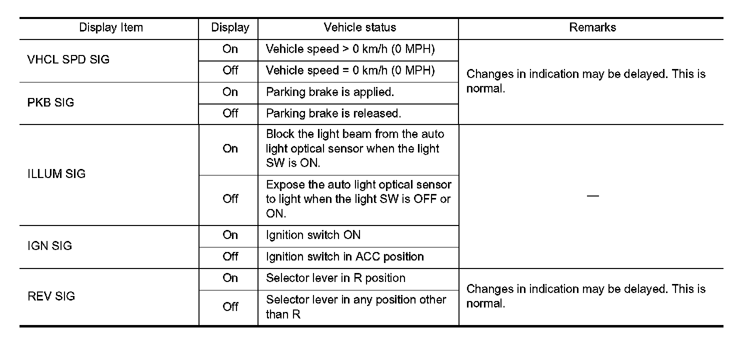 - Displays the status of the following vehicle signals inputted into the AV control unit.