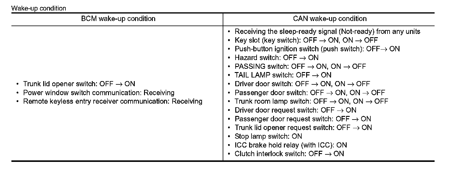 - BCM transmits the sleep wake up signal (wake up) to each unit when any of the CAN wake-up conditions is fulfilled. It changes from the low power consumption mode or the CAN communication sleep mode to the normal mode.